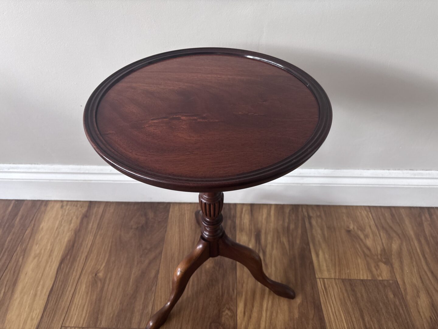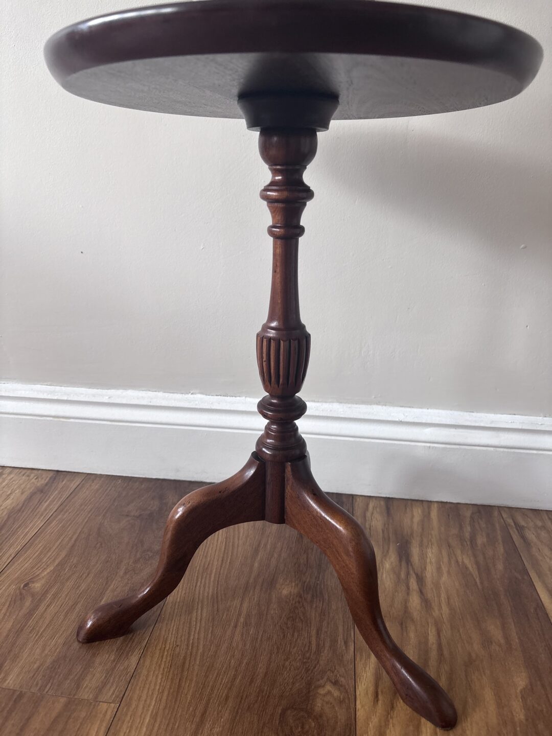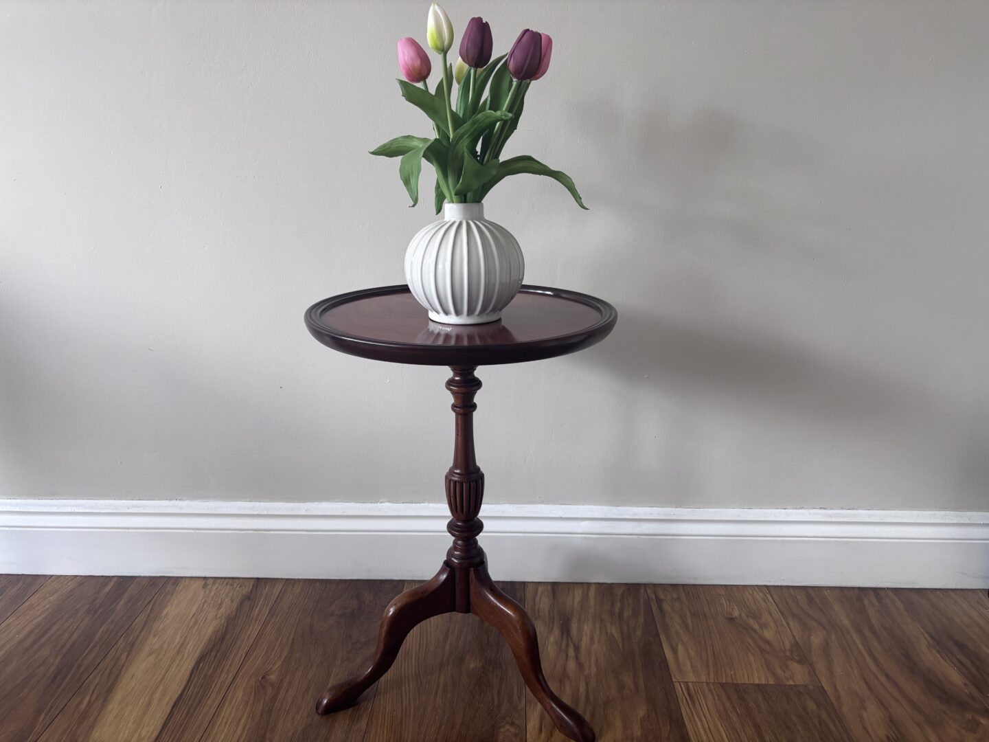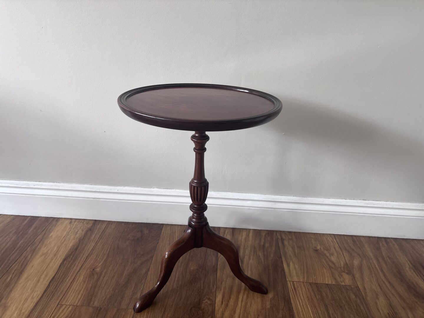 A vintage style mahogany wine table or side table with a turned central column sitting on a tripod base. This piece looks great next to an armchair and adds both elegance and functionality to your home.