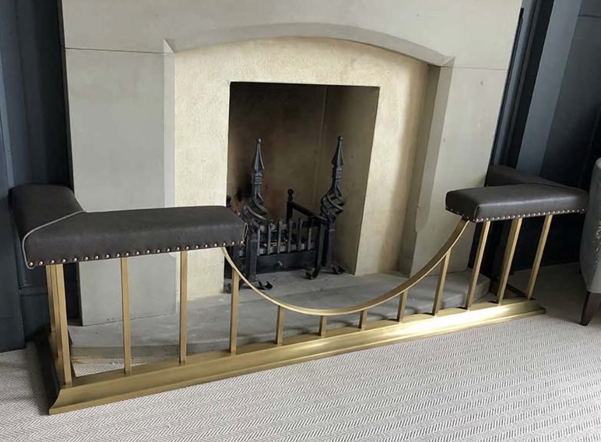 A burnished steel club fender seats with a 50mm high formed base, round uprights, a gap in the centre and the seats are upholstered in bellows leather.