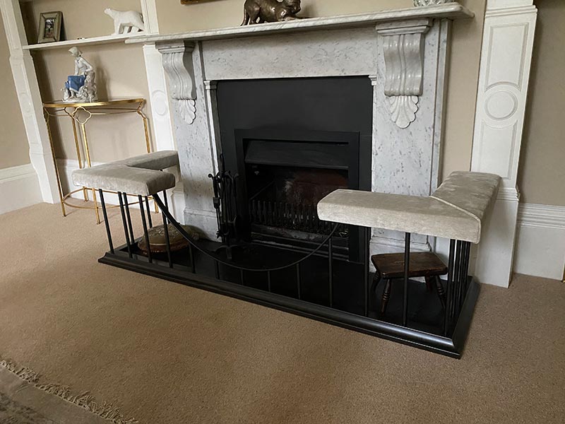 Each of the following fender seats can be ordered ‘as-is’ but sized to your exact requirement, or customised with different fabrics/materials etc. Most of them can be viewed in our works at 15 St David’s Square, Fengate,Peterborough. If you would like to discuss the full range of options available to you, find out the exact cost of having one of these fender seat designs tailored to your fireplace, or even arrange a visit, then please do get in touch. Please read our glossary for an explanation of terms used to describe fender seat styles, finishes & design options.